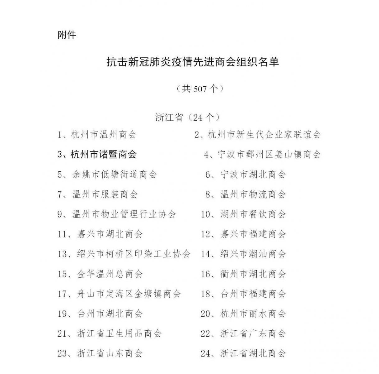 《全国工商联办公厅关于认定2019-2020年度全国“四好”商会的通报》(全联厅发〔2021〕5号),认定杭州市诸暨商会为2019-2020年度全国“四好”商会。显示诸暨商会在“政治引领好、队伍建设好、服务发展好、自律规范好”为主要内容的“四好”商会建设取得优异成绩。