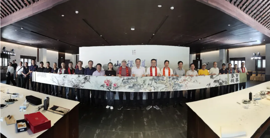 在戒兴法师挥毫启卷后,嘉宾与书画家们共同绘制了诸商《云水禅心》和《百花齐放》两幅18长卷,以细腻的苎麻布为画布。画卷中融入了诸暨的西施浣纱和祖国山水,共同勾勒出诸商创新创业美好未来的蓝图。